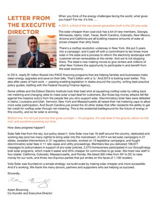 The 2014 annual report from Vote Solar highlights significant advancements in the solar energy sector, indicating that one-third of new power generation in the U.S. was solar, with states like New York committing to expanding solar capacity significantly. The organization successfully fought against unfair utility practices, promoted policies for net metering, and supported grassroots campaigns that delivered strong public support for solar initiatives. Looking forward, Vote Solar's ongoing efforts aim to make solar energy more accessible and affordable while advocating for innovative shared renewable programs that benefit diverse consumer groups.