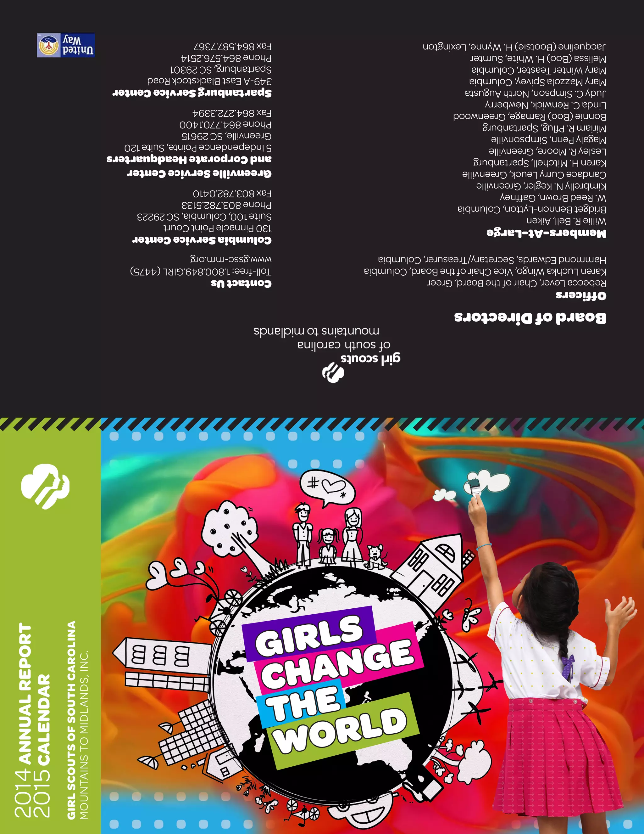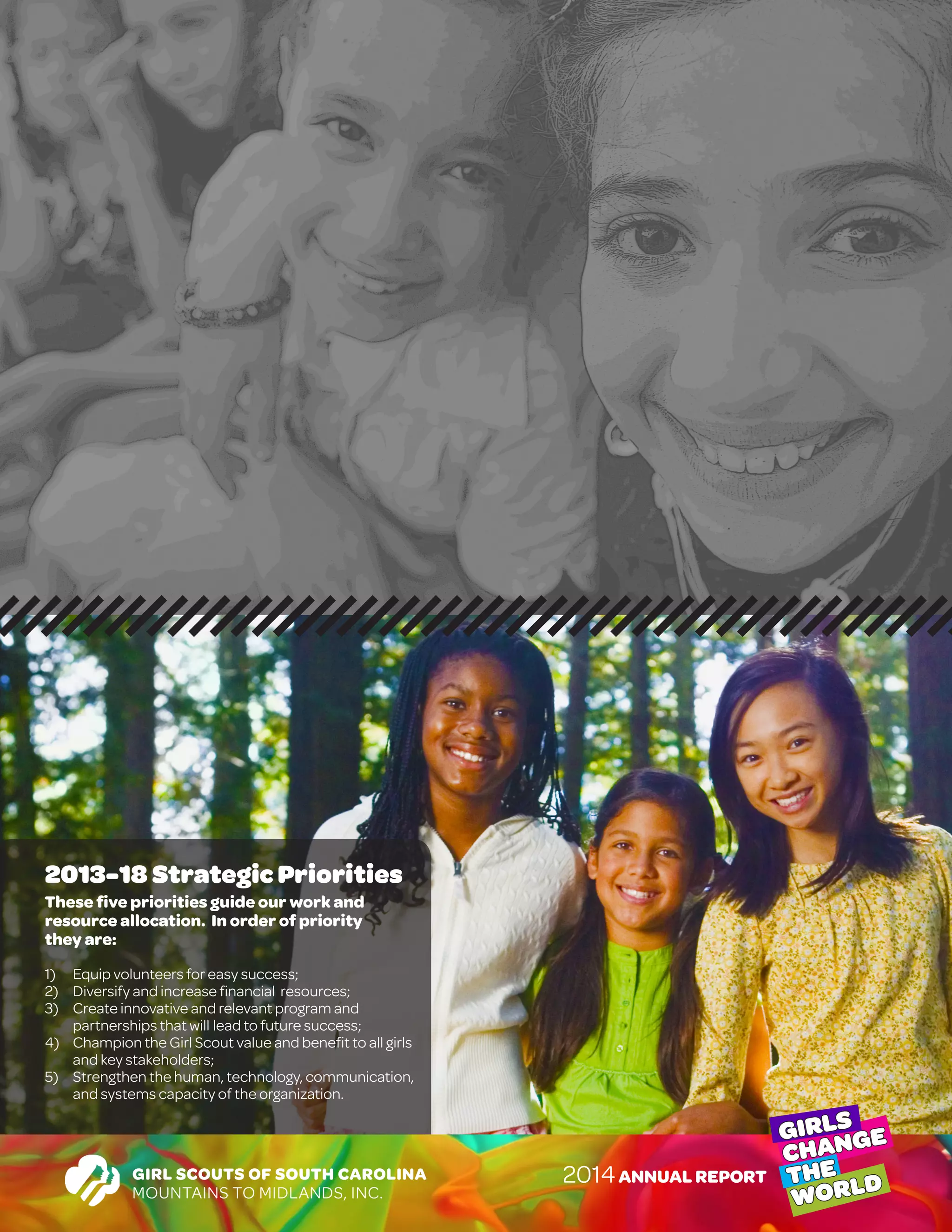 This document is the 2014 annual report for Girl Scouts of South Carolina Mountains to Midlands. It summarizes the organization's 2014 programming, leadership awards earned, and travel destinations attended by local Girl Scouts. While membership declined slightly from the previous year, the organization remained focused on providing high-quality leadership development opportunities for girls through programming in areas like STEM, literacy, and outdoor activities. Key events included piloting a new literacy program and expanding engineering-focused badge options. The report highlights the 22 Girl Scouts who earned the Gold Award and over 95 who earned the Silver Award for their leadership projects.