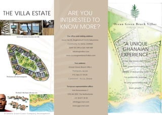 Ocean Green Beach Villas is a luxury villa estate and gated community located in Prampram, Ghana. It offers 4-star villas ranging from 3-4 bedrooms with floor areas above 130 square meters and additional amenities. The villas are designed for short or long-term stays and include features like private swimming pools, spacious terraces, gardens, and romantic bathrooms. More information can be found by contacting the listed office in Tema, Ghana or online.