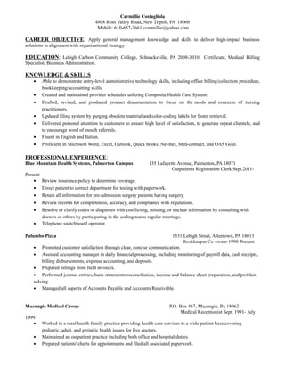 Carmillie Costagliola has over 20 years of experience in administrative, medical billing, and accounting roles. She has a certificate in Medical Billing Specialist from Lehigh Carbon Community College. Her resume highlights skills in areas such as office billing procedures, bookkeeping, scheduling, and customer service. She is currently an Outpatient Registration Clerk at Blue Mountain Health Systems, where her duties include insurance verification, directing patients, and ensuring medical record accuracy and compliance.