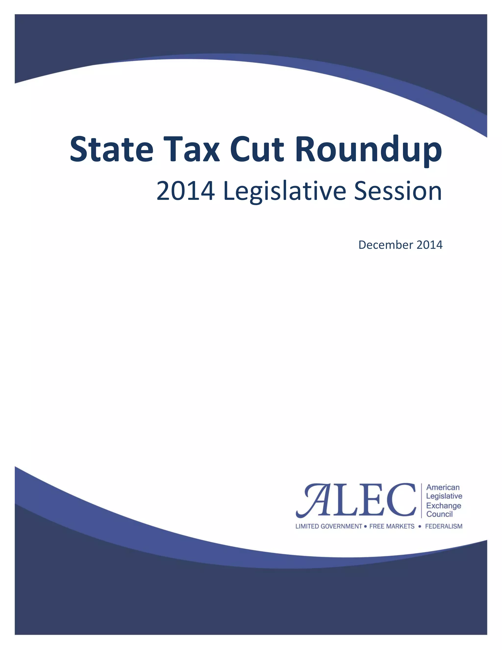 The document summarizes tax cuts passed by state legislatures in 2014. It discusses tax cuts in Arizona that exempt electricity/natural gas costs for manufacturers and require adjusting income tax brackets for inflation. It also discusses Florida cutting motor vehicle license renewal fees, saving drivers $20-25 each and $395 million total annually. The document is published by the American Legislative Exchange Council to discuss model public policies that expand free markets and economic growth.