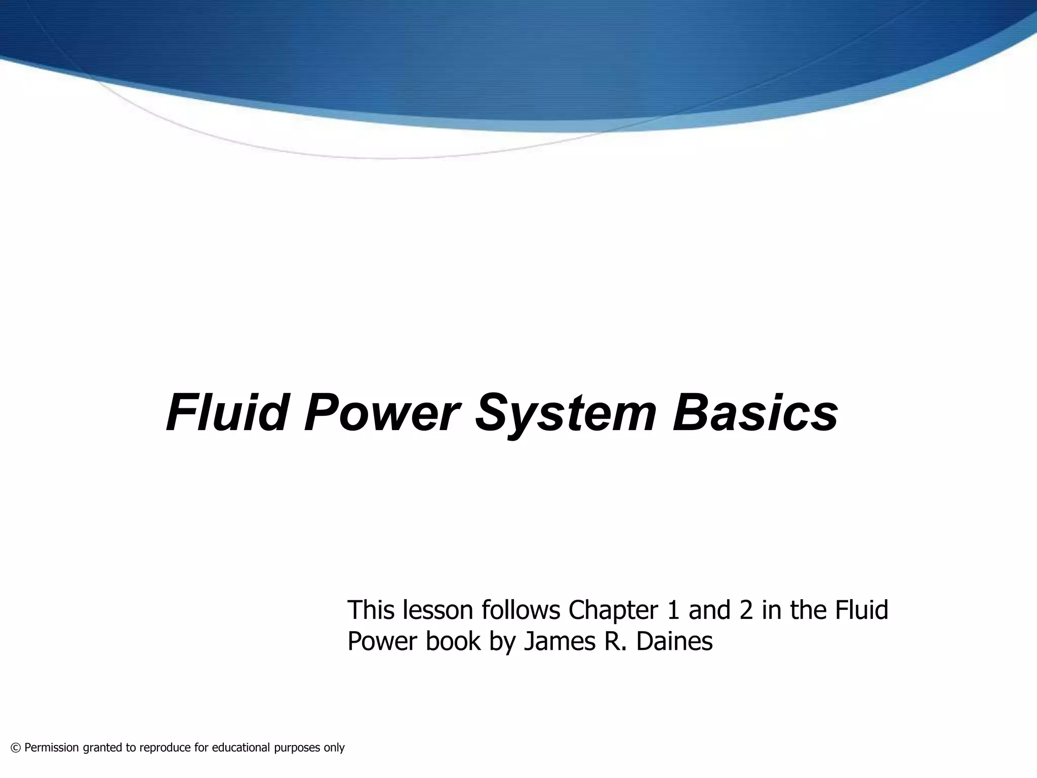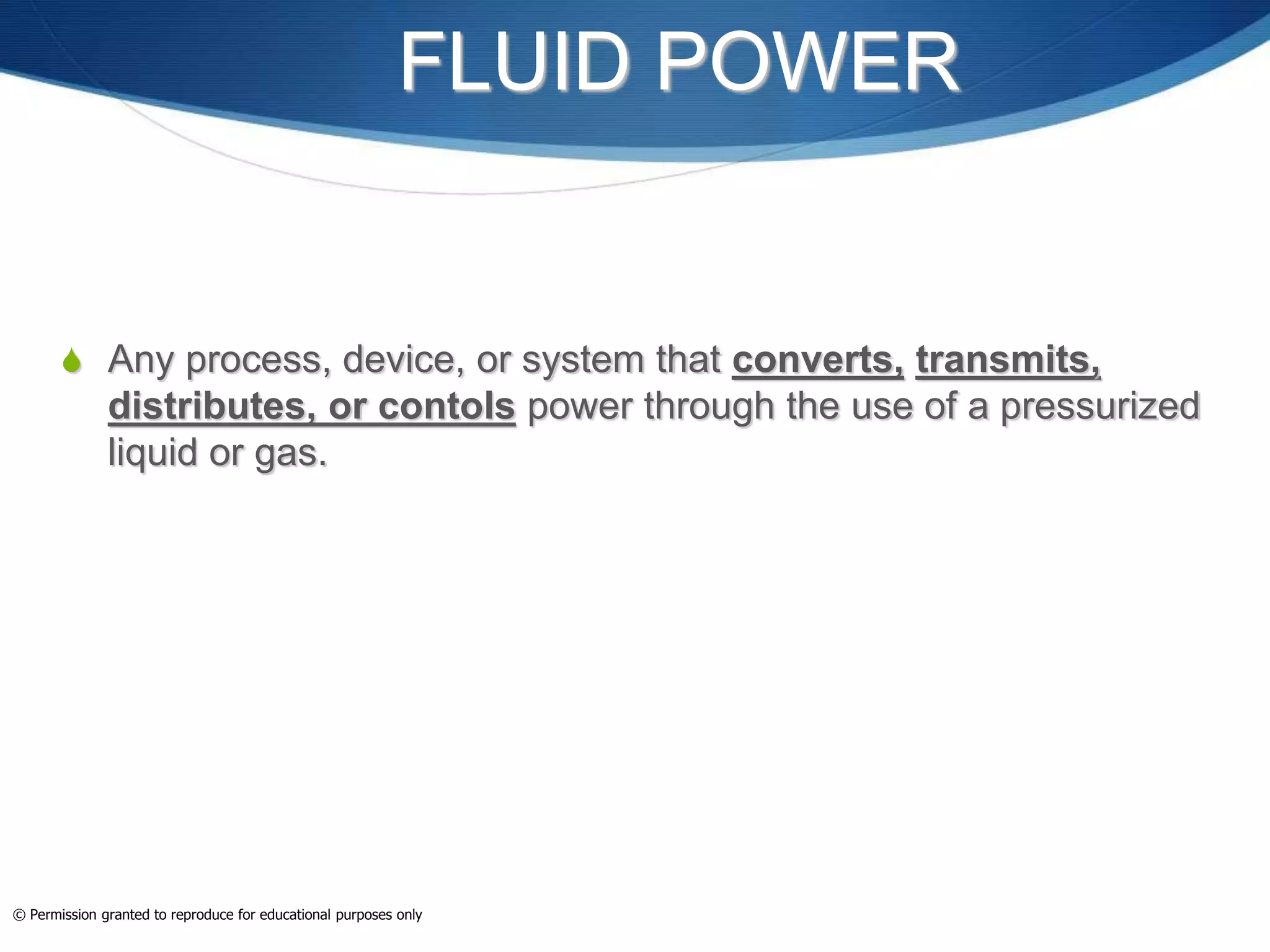 This document provides an overview of fluid power systems. It defines fluid power as any system that converts, transmits, or controls power through pressurized liquids or gases. The key components of fluid power systems include a prime mover, pump or compressor, transmission lines, and actuators. Fluid power systems are generally classified as hydraulic (using liquid) or pneumatic (using gas). The document then discusses the basic layout, functions, components and operation of hydraulic and pneumatic systems.