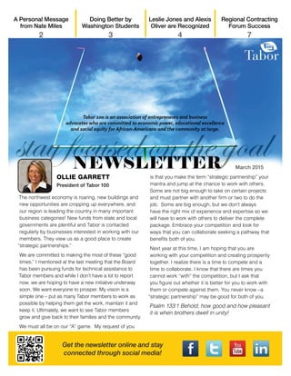 The March 2015 newsletter from Tabor 100 highlights various initiatives aimed at fostering collaboration among minority-owned businesses, with emphasis on pursuing strategic partnerships to create economic opportunities. It features updates on members' achievements, ongoing efforts in education funding reform, and community recognition for members Leslie Jones and Alexis Oliver. The newsletter also covers Seattle's recycling requirements for construction materials and upcoming meetings for Tabor 100 members.