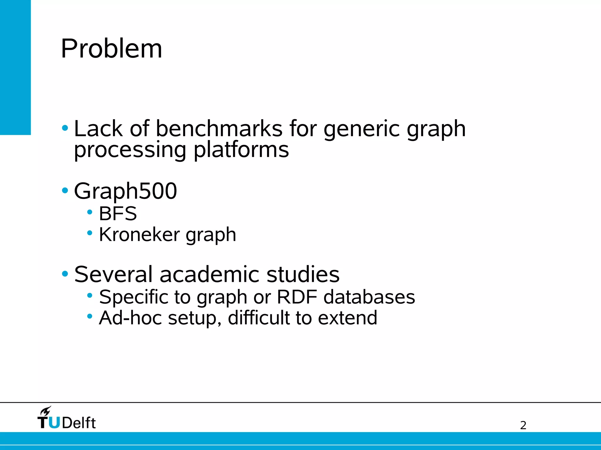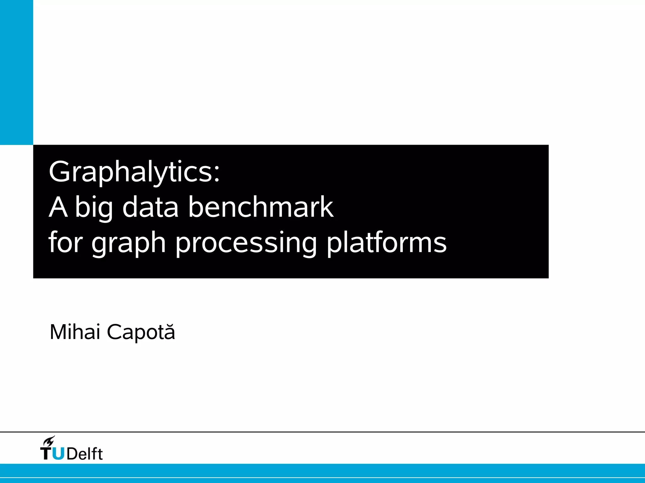 Graphalytics is an advanced benchmark harness for evaluating graph processing platforms. It performs choke-point analysis to identify key technological challenges. The benchmark workload targets these choke points to assess performance. It also features an enhanced LDBC Datagen tool that generates graphs with varying structural characteristics. Graphalytics aims to provide a standardized way to benchmark and compare different graph processing platforms.