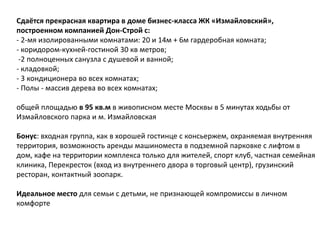 Сдается квартира в бизнес-классе в ЖК «Измайловский» общей площадью 95 кв.м с двумя изолированными комнатами, коридором-кухней-гостиной и двумя санузлами. В квартире есть современная кухня и сантехника, а также удобства такие как кондиционеры и полы с подогревом. Условия аренды: 80 тысяч рублей в месяц, без животных и курильщиков, желательно с детьми.