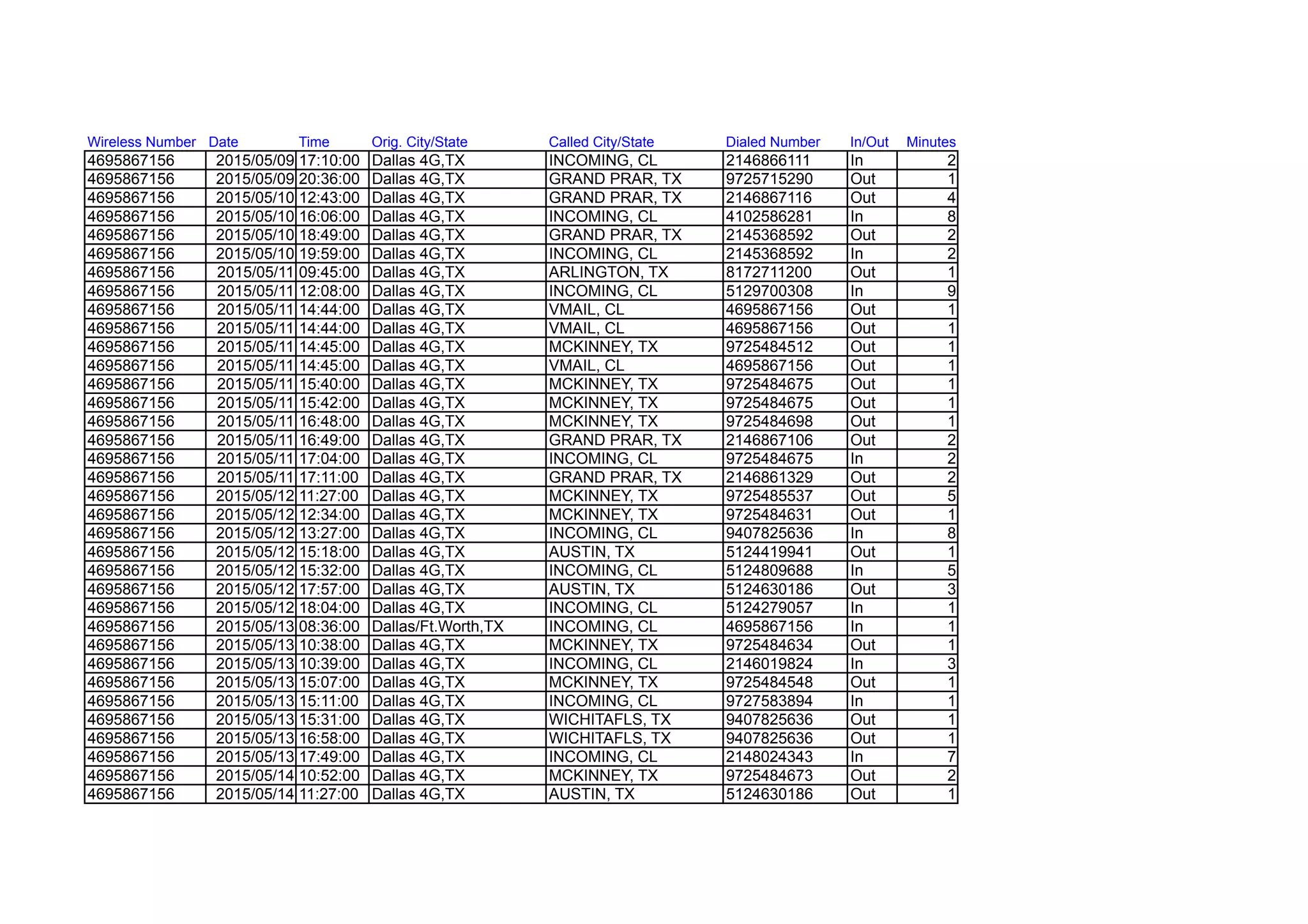 This document contains call logs for the phone number 4695867156 from May 9, 2015 to May 27, 2015. It lists the date, time, originating and receiving city/state, phone numbers dialed and called, and call duration in minutes for incoming and outgoing calls between Dallas, Texas and various cities in Texas and other states. The logs show frequent communication between Dallas and cities like Grand Prairie, McKinney, Austin, and Wichita Falls, Texas as well as some interstate calls to California and other locations.