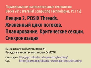 Документ представляет собой лекцию о потоках POSIX, охватывающую жизненный цикл потоков, планирование, критические секции и синхронизацию. Рассматриваются основные функции работы с потоками, примеры их создания и завершения, а также механизмы взаимного исключения. Также освещаются различные политики планирования и их применение в многопоточном программировании.