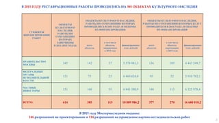 В 2015 году в Москве было произведено 385 реставрационных работ на объектах культурного наследия, с финансированием общим объемом 18,9 млрд рублей, из которых значительная часть была вложена в завершение работ на 37 объектах. К 2016 году планируется дальнейшее сокращение числа объектов в неудовлетворительном состоянии на 5%. Важными проектами стали работы в церкви Иоанна Предтечи и завершение реставрации памятников, приуроченных к 70-летию победы в Великой Отечественной войне.