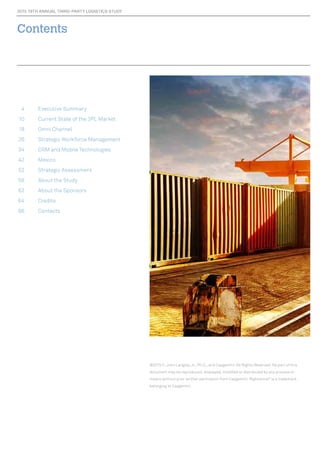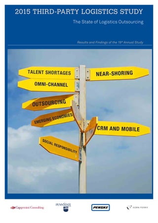 The 2015 third-party logistics study reveals a positive outlook for shipper-3PL relationships, with 92% of shippers and 98% of 3PLs reporting success. Despite cost reductions and improved service levels, challenges remain due to variable demand and the evolving landscape of omni-channel retailing. The report emphasizes the importance of strategic workforce management and investment in technology to enhance service offerings and meet customer expectations.