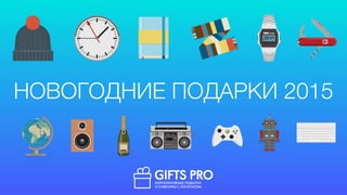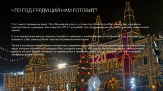 Документ представляет ассортимент новогодних подарков и корпоративных сувениров на 2015 год, связанных с символом года — овечкой. Включает различные изделия, от оригинальных сувениров и современных гаджетов до текстиля и аксессуаров, которые могут быть персонализированы с логотипом компании. Также описываются возможности создания индивидуального дизайна и минимальные партии для заказа.