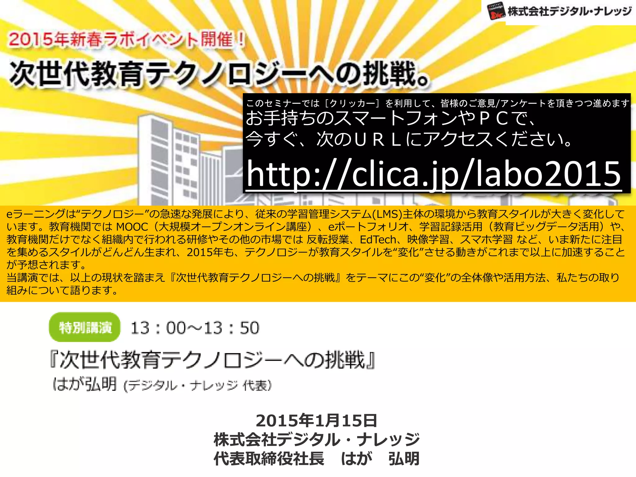 当講演では、以上の現状を踏まえ『次世代教育テクノロジーへの挑戦』をテーマに