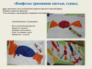 Документ описывает художественно-эстетическое воспитание детей дошкольного возраста, акцентируя внимание на рисовании предметов округлой формы и развитию творческих способностей. Упоминаются различные творческие проекты, такие как лепка, совместные поделки с родителями и выставки детских работ. Также рассматриваются народные игрушки и искусство, как важные элементы воспитания и творчества детей.