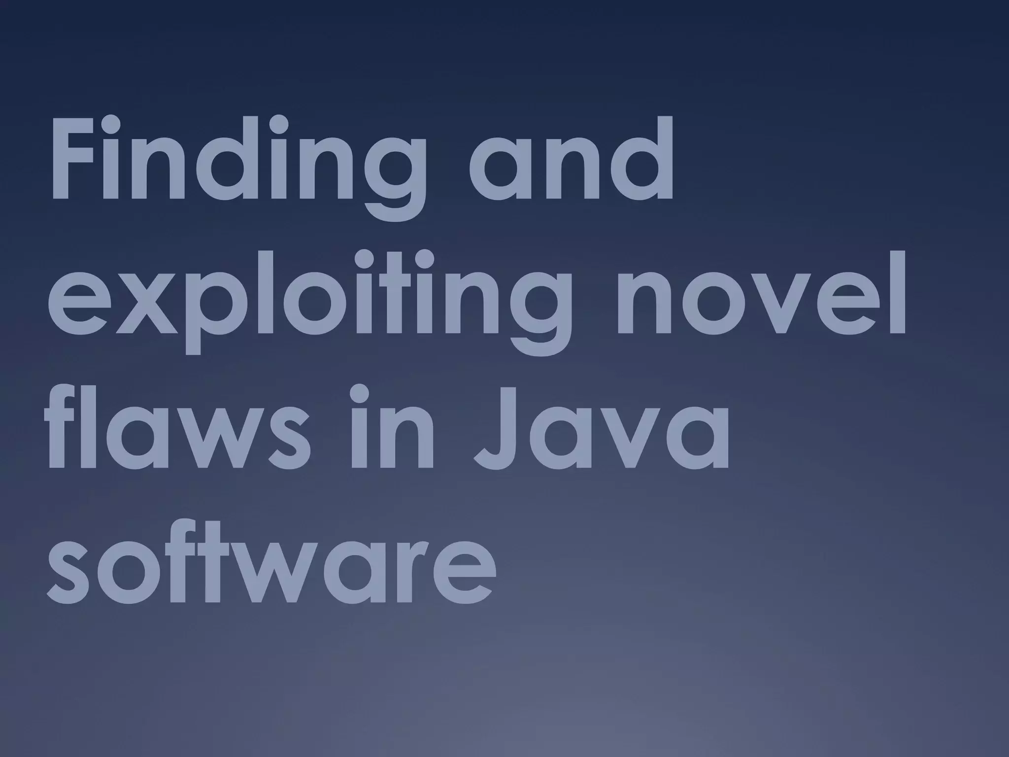 David Jorm introduces himself and his background in software engineering and security. He outlines several Java vulnerabilities he has found or plans to research, including issues related to SSL validation, authentication bypass, XML external entity injection, command injection, remote code execution via XSL extensions, path traversal, expression language injection, and remote code execution through deserialization flaws. He provides examples of exploits and discusses lessons learned for avoiding these types of vulnerabilities.