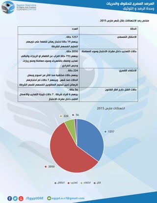 في مارس 5102، رصد المرصد المصري لحقوق الإنسان انتهاكات متزايدة بما في ذلك الاعتقالات التعسفية، التعذيب، والاختفاء القسري. تضمن التقرير اعتقالات واسعة النطاق لمواطنين، بما في ذلك أشخاص تعرضوا للاحتجاز في ظروف غير إنسانية، مما أدى إلى وفاة البعض نتيجة الإهمال. كما أشار إلى عمليات مداهمة للمنازل من قبل قوات الأمن واعتقالات قسري لشباب وأسرهم، مما يزيد من قلق الوضع الحقوقي في البلاد.