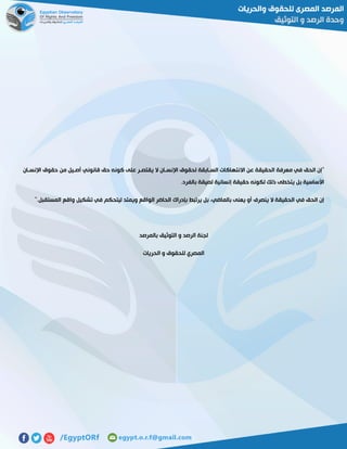 تقرير رصد انتهاكات حقوق الإنسان في مصر خلال الربع الأول من عام 2023 يظهر عددًا كبيرًا من الانتهاكات بما في ذلك 6363 حالة اعتقال تعسفي و522 حالة قتل خارج إطار القانون و306 حالات اختفاء قسري. التقرير يؤكد على الحاجة إلى الحق في معرفة الحقيقة حول الانتهاكات ويبرز المعاناة المستمرة للمواطنين في ظل الظروف الراهنة. يحذر التقرير من تدهور حالة حقوق الإنسان ويقدم توصيات لتحسين الأوضاع في مصر.