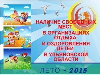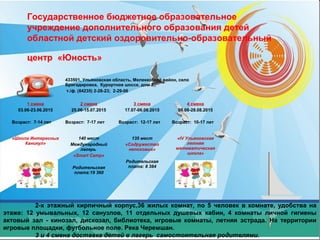 Документ описывает различные детские оздоровительные лагеря в Ульяновской области на лето 2015 года, включая информацию о количестве мест, возрасте детей, родительской плате и условиях проживания. Включает описание инфраструктуры лагерей, таких как жилые корпуса, комнаты для активностей и спортивные площадки. Также указаны даты смен и контакты для получения дополнительной информации.