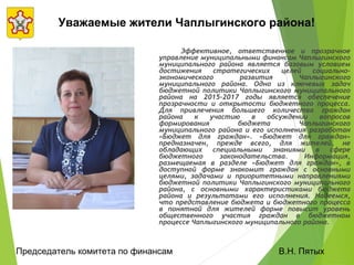 Документ описывает бюджетную политику Чаплыгинского муниципального района на 2015-2017 годы, акцентируя внимание на важности прозрачности бюджетного процесса и вовлечении граждан в его обсуждение через проект 'Бюджет для граждан'. Приведены основные финансовые показатели, такие как доходы, расходы и структуры бюджета, а также выделены приоритетные направления финансирования, включая образование, культуру и социальную политику. Также рассматриваются межбюджетные отношения и правила распределения доходов и расходов в рамках бюджетной системы России.