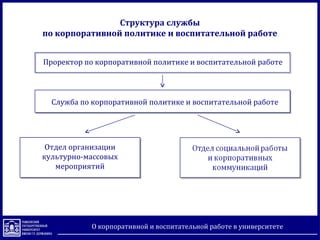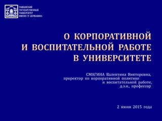 Документ представляет собой отчет о корпоративной политике и воспитательной работе Тамбовского государственного университета имени Г.Р. Державина, описывающий структуру и миссию университета, а также направления деятельности по задаче подготовки интеллектуальной элиты общества. В нем рассматриваются различные программы и проекты, включая развитие волонтерства и участие студентов в культурных и спортивных мероприятиях. Документ также включает показатели социальной работы и перспективные задачи для совершенствования воспитательной деятельности в университете.
