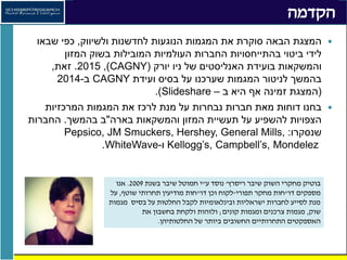 מצגת זו מנתחת את אסטרטגיית חברות המזון והמשקאות המובילות בצפון אמריקה, על פי המצגות שלהן בועידת האנליסטים של ניו יורק - CAGNY 2015. אנו מציגים גם את השינויים לעומת הניתוח שערכנו בשנה שעברה, על מנת לזהות מגמות אסטרטגיות על ציר הזמן.