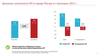 Документ содержит отчет о реализации проекта патентной системы налогообложения для индивидуальных предпринимателей в Москве за первое полугодие 2015 года, показывающий рост в количестве созданных патентов на 22% по сравнению с 2014 годом. Также отмечается увеличение интереса к патентной системе и предлагается расширение видов деятельности, позволяющих применять эту систему налогообложения. В документе также указаны планы на второе полугодие 2015 года по стимулированию предпринимателей и изменению законодательства.