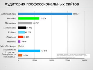 Документ представляет обзор аудитории врачебных интернет-ресурсов за июль 2015 года, включая статистику по зарегистрированным пользователям и динамике публикаций на различных сайтах. В документе приведены данные о посещаемости и активность пользователей на платформах, таких как doktornarabote.ru и vrachirf.ru, с информацией о росте аудитории в социальных сетях. Также указаны контакты автора отчета, Михаила Юрьевича Степанова, заместителя генерального директора ООО 'Доктор на работе'.