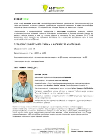 Компания RestTeam более 10 лет предоставляет тренинговые и консультационные услуги в области ресторанного и отельного бизнеса, проводя семинары в 25 городах. Семинар включает обучающие модули по управлению ресторанами, продажам, контролю расходов и мотивации персонала. Участники получат практические инструменты, шаблоны и бланки, способствующие повышению эффективности работы заведения.