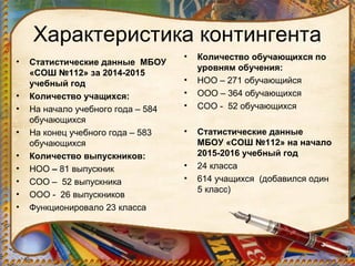 Документ содержит статистические данные о деятельности и контингенте МБОУ "СОШ №112" за учебные годы 2014-2015 и начало 2015-2016. В нем приведены сведения о количестве учащихся, выпускниках, оборонительной и инновационной деятельности, а также результаты образовательных программ и аккредитации школы. Также рассматриваются финансовые аспекты и состояние материально-технической базы учебного заведения.