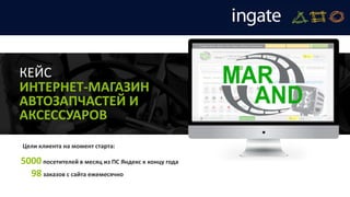 Документ описывает реализацию performance-решений для интернет-магазина автозапчастей, целью которого было увеличение трафика и конверсии. Проводится анализ целевой аудитории, методов привлечения клиентов и усовершенствования сайта, что привело к значительному росту трафика и заказов. Итоговые результаты включают увеличение посещаемости и конверсии, а также разработку индивидуальных стратегий для достижения целей клиента.