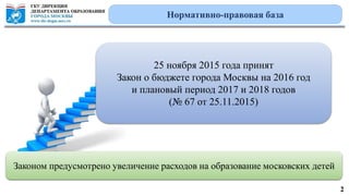 Доклад обсуждает использование денежных средств школами в Москве в декабре 2015 года, включая анализ расходов и остатки на счетах. Уделяется внимание законности и целесообразности расходов, а также необходимым финансовым мероприятиям до конца года. В документе также упоминаются проблемы с состоянием школьной инфраструктуры и обязательства по выплатам зарплат и расчетам с контрагентами.