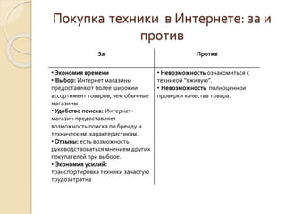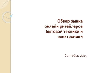 Документ представляет собой обзор рынка онлайн-ритейлеров бытовой техники и электроники на сентябрь 2015 года, описывая преимущества и недостатки покупки техники через интернет. Объем онлайн-продаж в этой категории увеличился на 30.6% в 2014 году, однако в первом полугодии 2015 года наблюдается снижение на 2.4% из-за насыщения рынка и экономических проблем. Рынок характеризуется высоко конкурентной средой, где игроки ищут способы диверсификации ассортимента и улучшения клиентского сервиса.