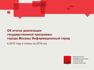Документ содержит результаты реализации государственной программы 'Информационный город' Москвы за 2015 год и планы на 2016 год, включая статистику по инфокоммуникационным технологиям, образованию, здравоохранению и ЖКХ. Приведены данные о росте цифровых услуг и инфраструктуры, а также о внедрении электронных сервисов для граждан. Отмечены достижения в оценках международных рейтингов и планы по развитию технологий в следующем периоде.