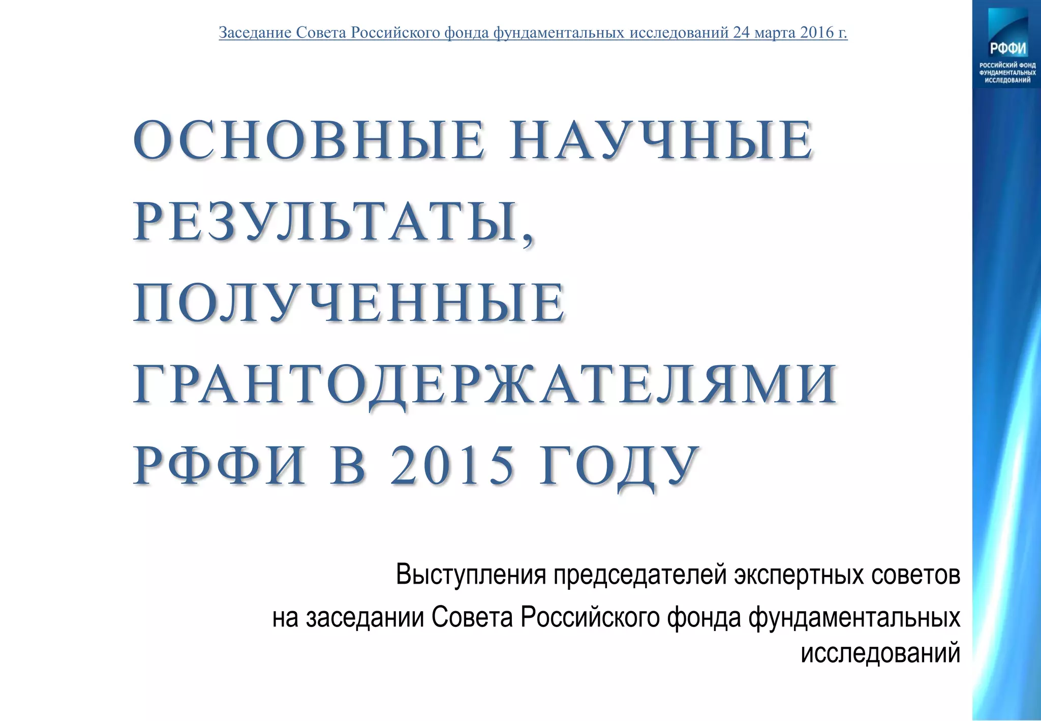Документ содержит основные научные результаты грантодержателей РФФИ за 2015 год, включая достижения в математики, физике, биологии и химии. Приведены примеры успешных исследований, таких как теоремы в алгебре, прототипы новых медицинских систем и изучение генетических факторов регенерации у высших позвоночных. Акцентированная междисциплинарность и значимость полученных выводов для развития различных научных областей.