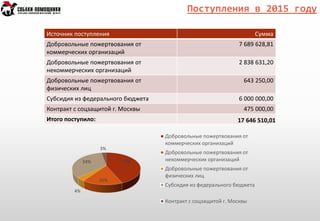 Отчет за 2015 год показывает, что организация «Собаки-помощники» получила 17 646 510,01 рублей, из которых 43% составили добровольные пожертвования от коммерческих организаций. Основные расходы составили 11 360 485,00 рублей, включая зарплаты и затраты на услуги, что в целом позволило помочь 17 незрячим людям и развить канистерапию для детей с особенностями развития. Организация также провела различные мероприятия, включая семинары и фестивали, для повышения осведомленности о помощи незрячим и канистерапии.