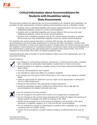 This document provides guidance on appropriate accommodations for students with disabilities taking state assessments. It outlines that accommodations should be individualized based on student need and routinely used during instruction. Accommodations are divided into two types: Type 1 can be provided locally while Type 2 require state approval. Planning and documentation are important to ensure students receive allowed accommodations. The document provides multiple examples and considerations for various accommodations.