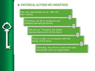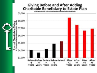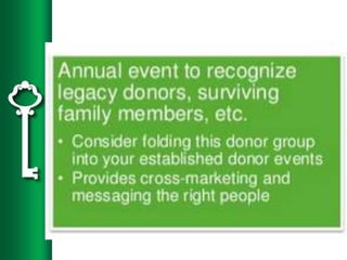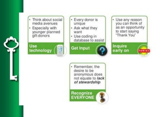 Planned giving donors are individuals who make future gifts to nonprofits, often through their estate plans. This type of giving allows donors to make significant contributions that have tax benefits. The document encourages connecting with and thanking planned giving donors.