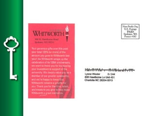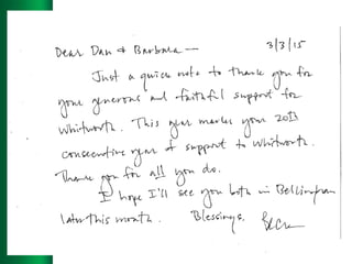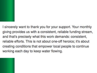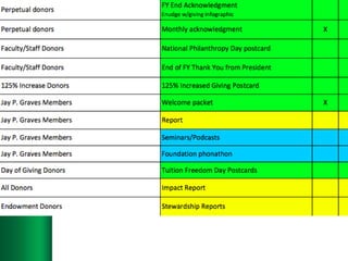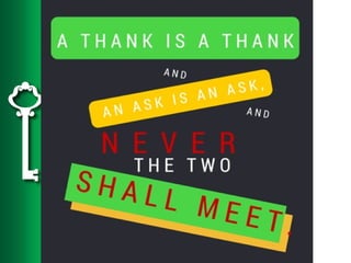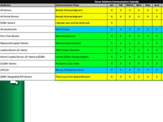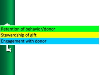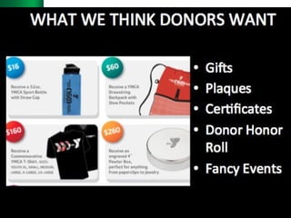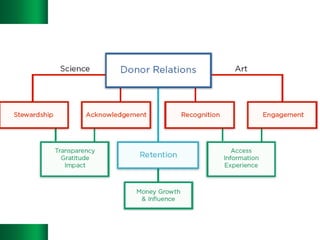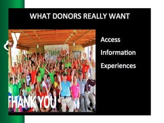 This document discusses the importance of donor retention and relationship building rather than focusing solely on transactions. It recommends having specific reports on donor giving patterns, retention, and lapsed donors in order to make informed decisions. The document stresses using more imaginative communications to inspire and engage donors through brilliant writing, packaging, and presentation.