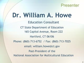 This document provides an overview of a conference on developing a multicultural curriculum held from April 16-18, 2015 in Hartford, Connecticut. The conference was presented by Dr. William A. Howe from the Connecticut State Department of Education and focused on understanding culture and how it influences learning, implementing multicultural education to increase academic achievement, and enhancing school culture. The document outlines the learning objectives and agenda topics for the conference, which include defining culturally responsive education, the importance of being multilingual, working with bias, constructivist listening skills, cultural competence skills, and lesson planning for multicultural education.