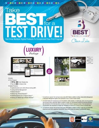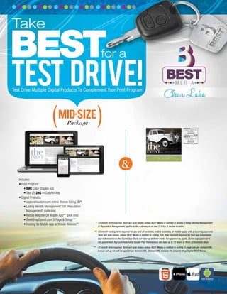The document outlines various advertising packages offered by Best Media, including print and digital products with terms of 12 months and auto-renewal. Each package includes services like color display ads, online listings, mobile websites/apps, and requires full payment prior to final app submission. Specific conditions apply for hosting and app submissions to app stores, with the domain remaining the property of Best Media.