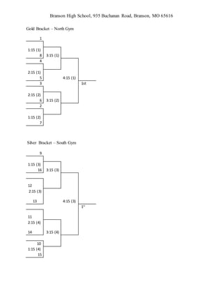 The document provides information about the 2015 Branson Invitational volleyball tournament including pool and bracket structures. Sixteen teams will be divided into four pools of four teams each to play a round robin. Pool play will consist of best-of-three sets and teams will be ranked 1-16 based on win-loss record, point differential, and head-to-head results. The top eight teams will advance to the gold bracket and bottom eight to the silver bracket for single elimination bracket play consisting of best-of-three sets.