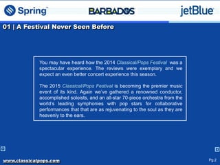 The document is a brochure for the 2015 Classical/Pops Festival in Barbados from December 11-12. It summarizes that the 2014 festival was very popular and successful, and the 2015 edition will feature a renowned conductor, pop superstars, soloists, and a 70-piece orchestra. The festival will include performances at venues like Independence Square in Bridgetown and the Apes Hill Club in St. James featuring groups like Sons of Serendip and Time For Three alongside the orchestra.