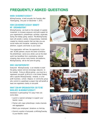 This document provides frequently asked questions about #GivingTuesday, which is an annual global day of giving held on the Tuesday after Thanksgiving. It explains that #GivingTuesday benefits non-profits by increasing exposure and support during the holiday giving season. Any individual or organization can participate for free by promoting donations or fundraising campaigns using the #GivingTuesday hashtag on social media and other channels. While the #GivingTuesday movement encourages participation, it does not directly accept or distribute donations.