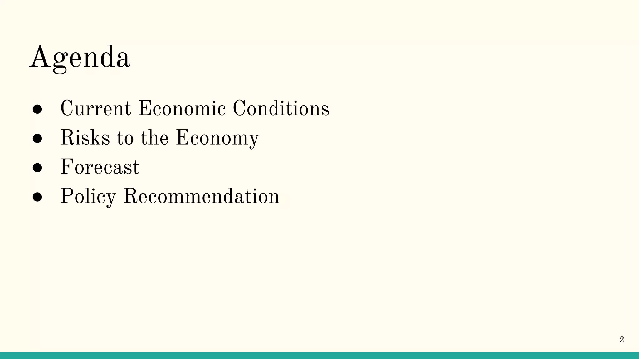 The document provides an overview of the current economic conditions in the United States, risks to the economy, a one-year forecast, and a policy recommendation from the Federal Reserve. It finds that aggregate demand is strengthening, labor markets are improving but still show some slack, and inflation remains below target. The forecast predicts real GDP growth of 2.7%, unemployment falling to 4.7%, and both overall and core PCE inflation around 1.7-1.8%. The policy recommendation is to raise the target federal funds rate range to 0.25-0.5% while continuing other quantitative easing programs.