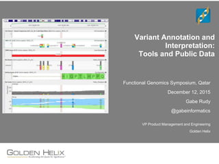 The document discusses tools and public data for variant annotation and interpretation in functional genomics. Key topics include the ACMG guidelines for variant classification, visualization of variants, and the importance of accurate gene annotations and public databases. It emphasizes the need for effective variant representation and the integration of public data to support clinical decisions in genetics.