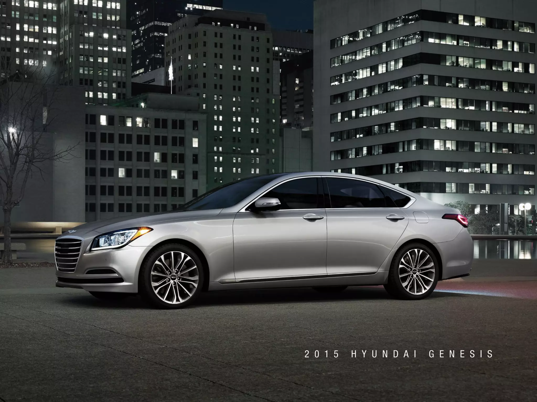 The document summarizes the new 2015 Hyundai Genesis sedan. It highlights key design and technological enhancements over previous models, including a longer wheelbase for more interior space, a reinforced chassis for a smoother ride, and powertrain improvements. It also describes new safety technologies like blind spot detection and automatic emergency braking. The document emphasizes that Hyundai aimed to surpass competitors like BMW and Mercedes in performance, handling, luxury, and innovation with the new Genesis.
