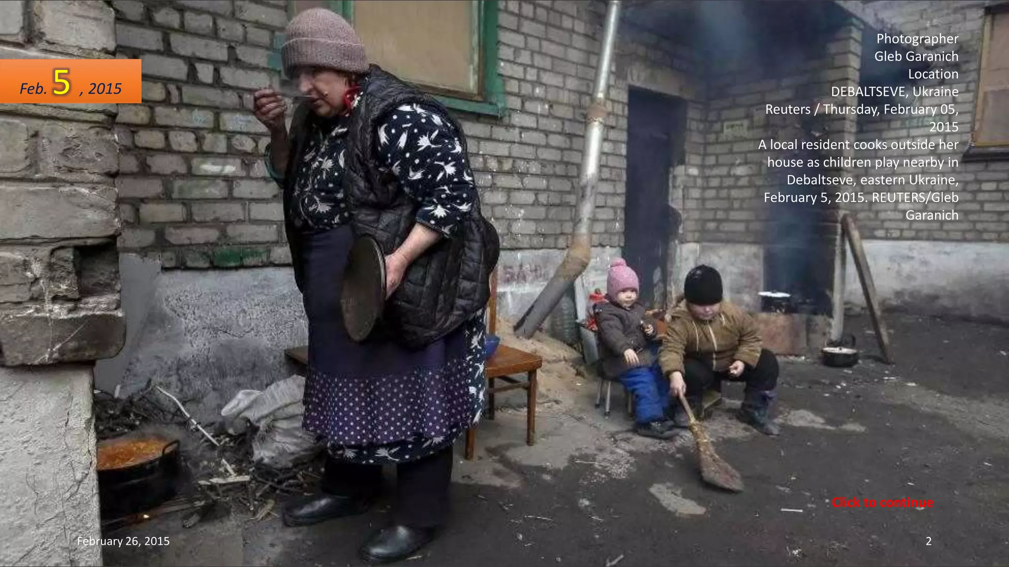 The document is a collection of news photos from February 9, 2015. It includes photos from Ukraine showing damage from shelling in Debaltseve and Donetsk. It also includes photos from Syria of casualties and damage from reported air strikes and shelling by government forces in Damascus. Additional photos show scenes from Gaza of Palestinians living in damaged houses following the 2014 war with Israel.