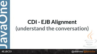 The document discusses the alignment of EJB and CDI technologies, outlining the historical context and influences on CDI's development. It highlights key changes in Java EE versions, the adoption of CDI by EJB and other technologies, and the challenges faced in achieving full alignment. Additionally, it addresses common mistakes made by developers and the advantages of using CDI, such as its extensibility and open-source nature.