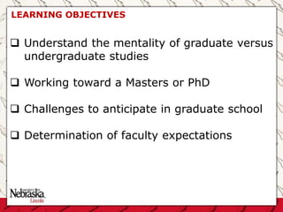 The document summarizes key aspects of graduate school experiences, including: