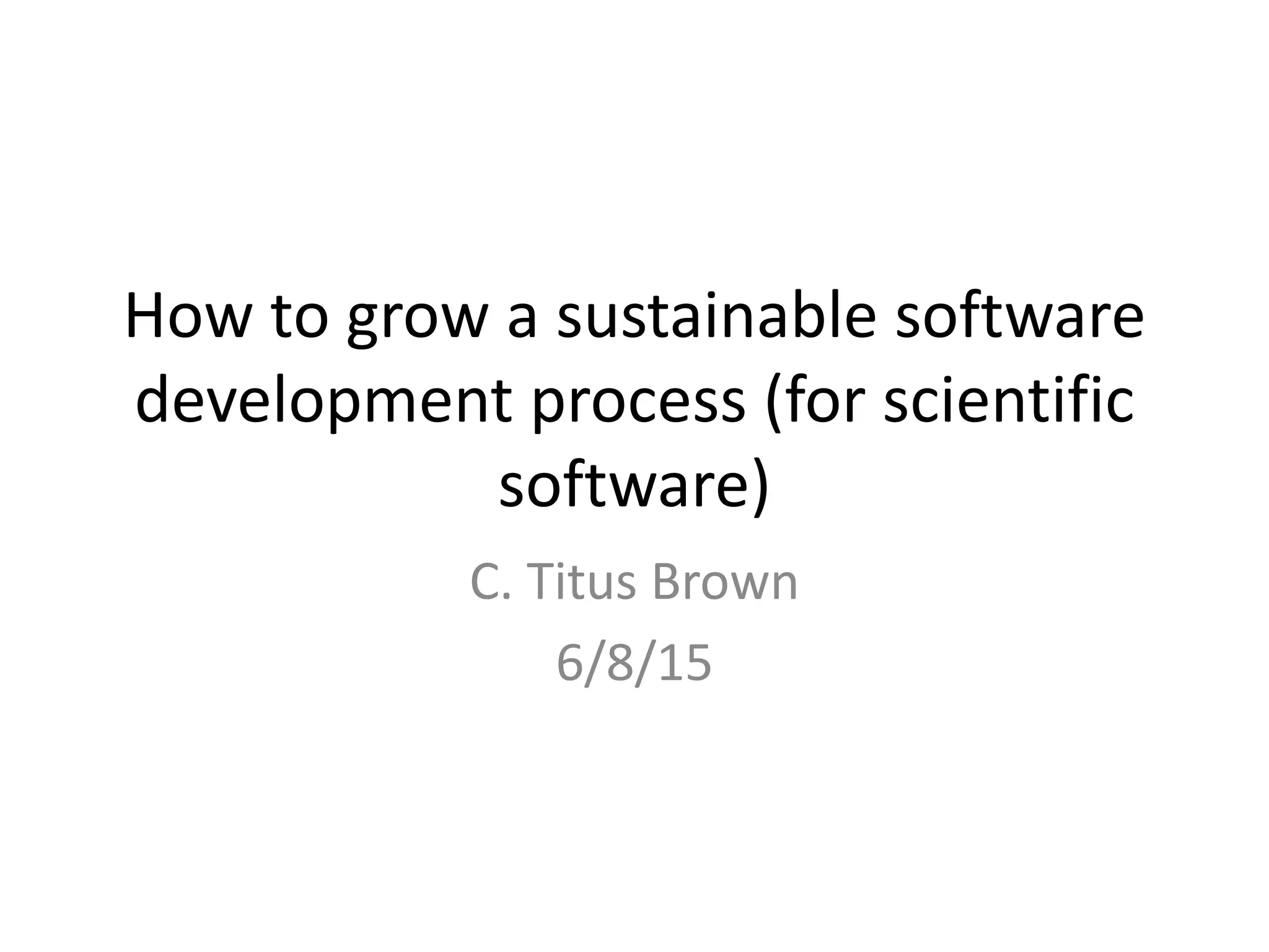 This document outlines strategies for establishing a sustainable software development process in scientific software projects, using the Khmer project as a case study. Key recommendations include utilizing version control, adhering to merge checklists, automating tests, and employing continuous integration to enhance code quality and reliability. Emphasizing the importance of addressing pain points in the development process, the document advocates for a pragmatic approach to testing and releases.