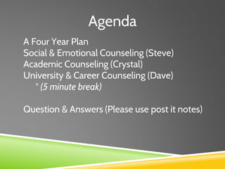 This document outlines a presentation for grade 9 parents on navigating high school. It discusses the counseling program and team, diploma options, graduation requirements, course pathways, standardized tests, college admissions factors, and upcoming events. Counselors provide social/emotional, academic, and career guidance. They encourage finding balance, self-discovery, and autonomy while providing support. Counselors help students develop organization skills and explore interests through various activities and course options. College admissions considers grades, test scores, activities, and essays. The goal is helping students find their best-fit university.