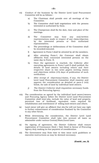 This document outlines procedures for procuring land willingly sold by owners in Telangana, India for public projects. It establishes a District Level Land Procurement Committee to (1) ascertain owner willingness, (2) negotiate consideration amounts including market value and resettlement costs, and (3) approve agreements signed by owners. The committee is chaired by the District Collector and includes representatives from procuring agencies, revenue departments, and land administration. Owners must sign affidavits agreeing not to pursue higher compensation in court.
